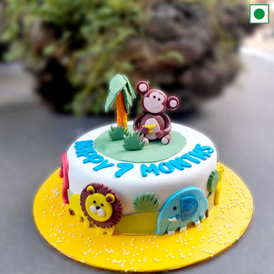 The Animal Kingdom Cake is an adorable jungle adventure! Featuring a playful fondant monkey under a palm tree, surrounded by a cute lion, elephant, and other jungle friends, this cake is perfect for celebrating little milestones. With bright colors and charming animals, it's a wild delight for any party!