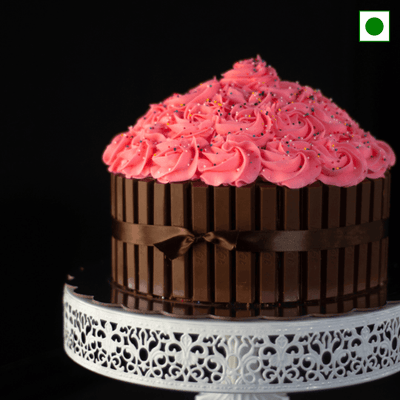 "Embrace sweetness with this adorable cake, hugged by Kit Kat walls and adorned with creamy roseattes on top, a delightful blend of charm and indulgence."