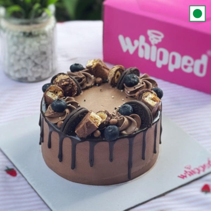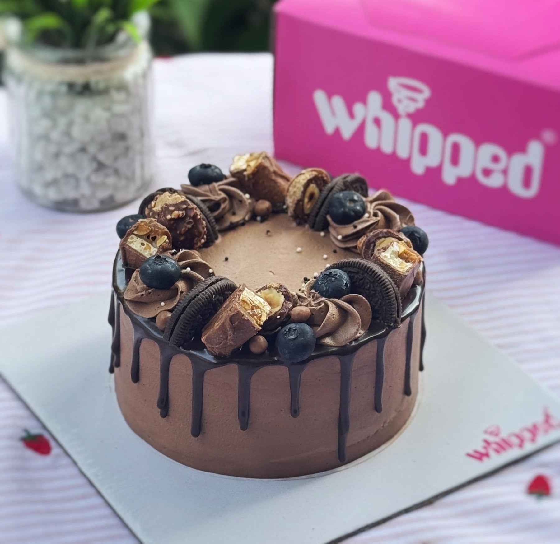 Classic chocolate cake crowned with Oreos and golden chocolate bites.