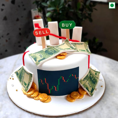 A playful stock market-themed cake, topped with edible charts, and fondant bills. Perfect for finance lovers, this cake combines sweetness with a touch of Wall Street fun!